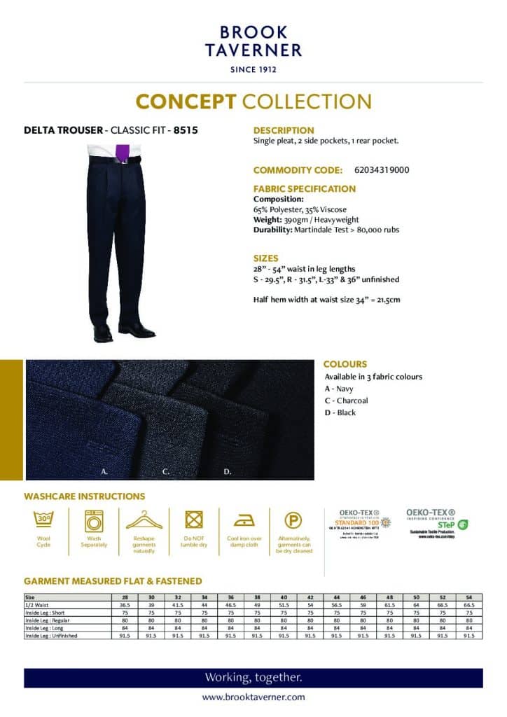 Single pleat trousers, machine washable. Oeko-Tex certified. Ethical Trading Initiative certified. Reach certified. SEDEX certified.